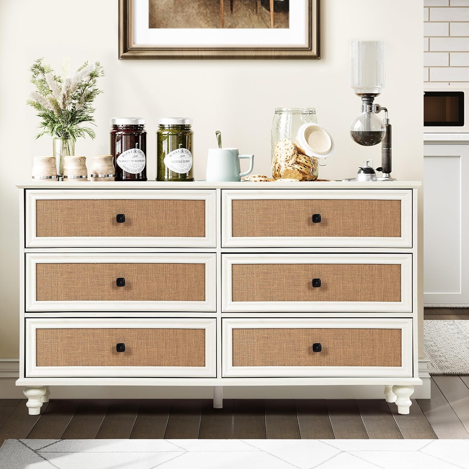 6-Drawer Modern White Farmhouse Dresser – Natural Rattan Fronts